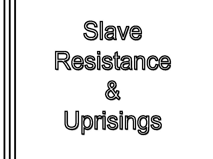 Slave Resistance 1. Refusal to work hard. 2. Isolated acts of sabotage. 3. Escape via the Underground Railroad.