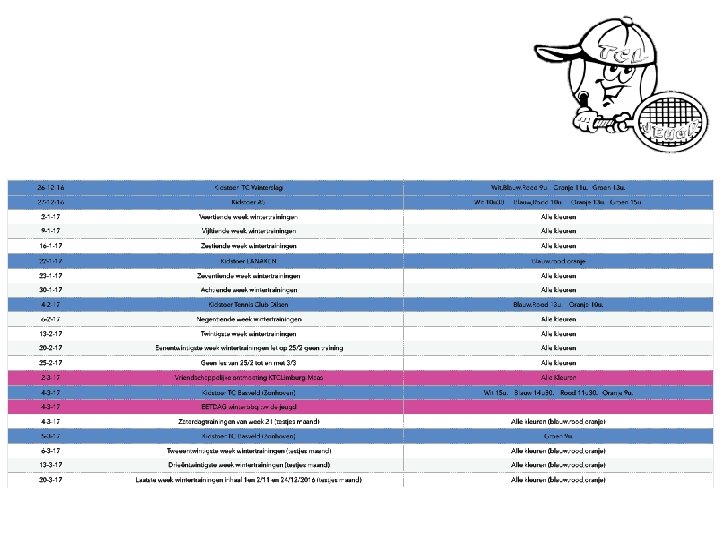 • Jeugdbeleid – Recreatieve club, waar competitie zijn plaats heeft, maar waar het kind ‘kind’ moet kunnen zijn – Mogelijk om bij TC Lanaken uit te groeien tot goede B 0 / B 15 – Indien thuisclub 5028 TC Lanaken (= geen competitie voor andere club spelen) volgende 2 voordelen: • Tennisles en tenniskamp volgen bij TCL • Elders competitie spelende kinderen mogen wel nog steeds lid worden, participeren aan recreatieve organisaties en clubkampioenschap.