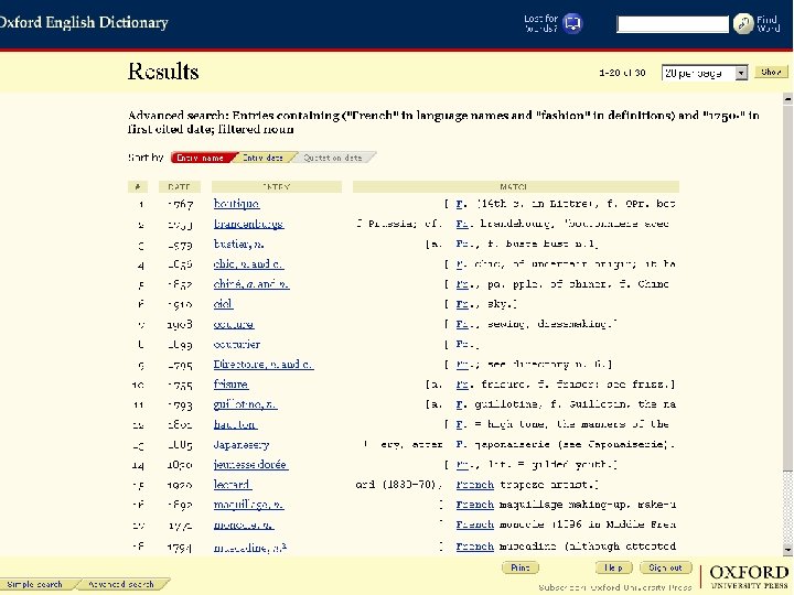 Paprasta paieška Šioje paieškoje galite pasirinkti: – Visą tekstą (Full text) / apibrėžimą (definitions) / etimologiją (etymologies) / kalbos pavadinimą (language names) – Citatas (Quotations) / citatų datas (Quotation date) / autorių (author) / darbą (work) – Pirmąją citavimo datą (First cited date) / autorių (author) / darbą (work) Šioje paieškoje galite naudoti artumo operatorius Proximity Searches) Oxford University Press 2006