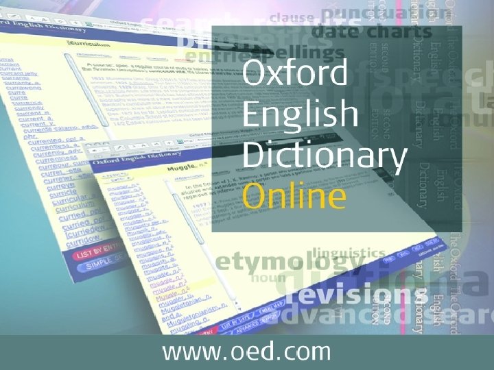 Duomenų bazėje • • • Yra per 600 000 apibrėžimų Yra per 2, 5 mln. žodžio kontekstą aiškinančių pavyzdžių Aiškinama anglų kalbos per paskutiniuosius 1500 metų evoliucija Pateikiami visose angliškai kalbančiose šalyse naudojami žodžiai ir frazės Kasmet publikuojama per 6 000 naujų arba atnaujintų apibrėžimų http: //dictionary. oed. com/ http: //www. oed. com Oxford University Press 2006