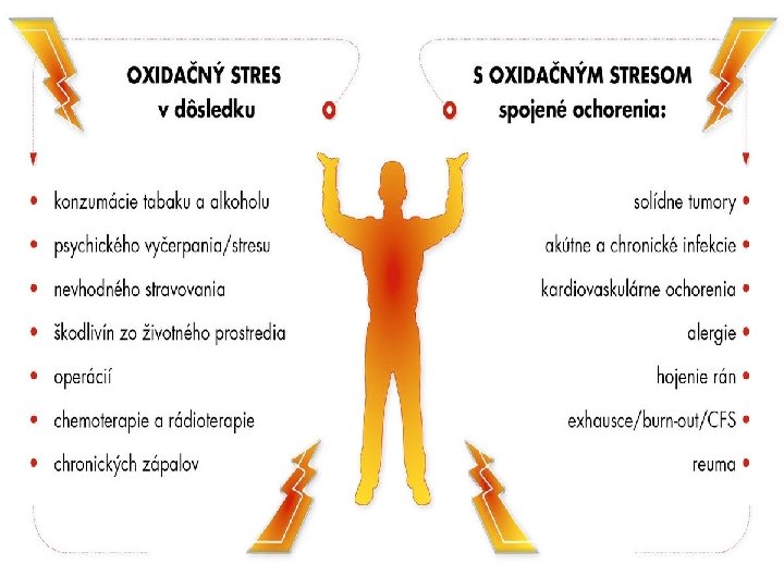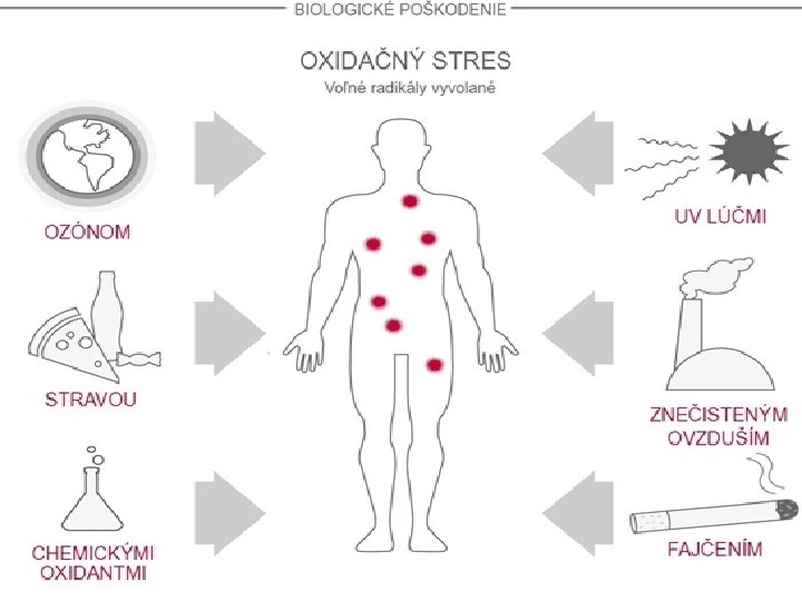 Človek potrebuje kyslík, aby mohol žiť, ale prostý akt vdychovania kyslíka vytvára vysoko reaktívne molekuly, tzv. voľné radikály. Pri interakcii voľných radikálov s ďalšími molekulami v tele vzniká oxidačné poškodenie, ktoré môže viesť k rozvoju celého radu chorôb a ochorení. Aby sme mohli hovoriť o oxidačnom strese, mali by sme najskôr vedieť, čo sú to voľné radikály a antioxidanty. Voľné radikály sú atómy alebo skupiny atómov (molekuly), ktoré majú aspoň jeden nespárený elektrón. A tak hľadajú spôsob, ako svoje nespárené elektróny spáriť. Siahajú po susednej molekule, ktorej elektrón ukradnú a tak sa z nej stáva voľný radikál, ktorý opäť siaha po susednej molekule. V našom tele sa takto spustí reťazová reakcia, ktorá môže skončiť dvojako. Postupne bude ničiť všetko, čo jej stojí v ceste alebo ju zastavia protivníci voľných radikálov – antioxidanty, ktoré ich dokážu neutralizovať, čím ich menia na neškodné.