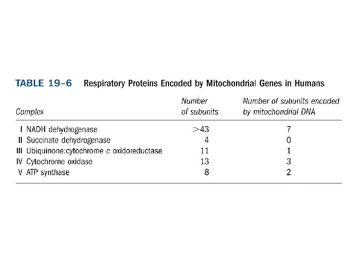Mitochondrial genes • Mitochondria contain their own genome, a circular double-stranded DNA (mt. DNA) molecule. 粒線體內有一環狀的 雙股螺旋的DNA。內含 37個基因。 • The human mitochondrial chromosome contains 37 genes, including 13 that encode subunits of proteins of the respiratory chain; the remaining genes code for r. RNA and t. RNA molecules essential to the protein-synthesizing machinery of mitochondria.