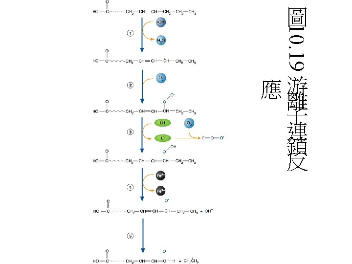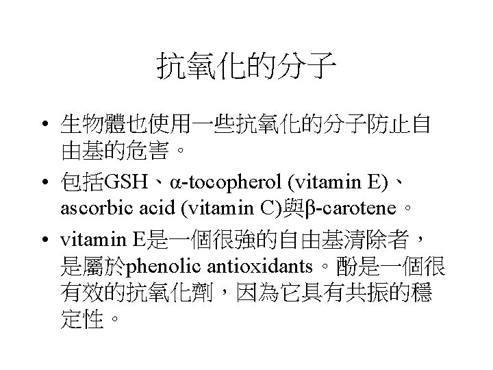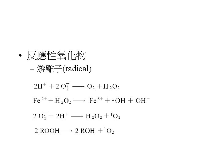 Reactive oxygen species (ROS) • ROS包含Superoxide radical (.O 2 - )、 hydrogen peroxide (H 2 O 2)、hydroxyl radical (.OH)與singlet oxygen( 1O 2 )。因為ROS相當reactive,易引起一些 鏈鎖反應。如lipid peroxidation reaction: hydroxyl radical會攻擊一 些脂肪酸,引起鏈鎖反應。食品加 時 常會促進這種radical chain reaction, 常需加入抗氧化劑,阻止radical chain reaction的反應。