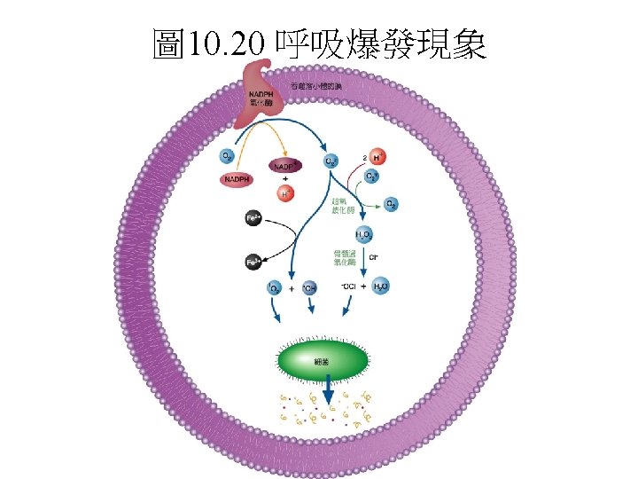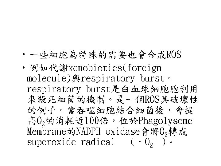 • The superoxide free radical generated, ·O 2 - is very reactive and can damage enzymes, membrane lipids, and nucleic acids. • Superoxide含自由基對酵素、膜與核酸 具破壞性。