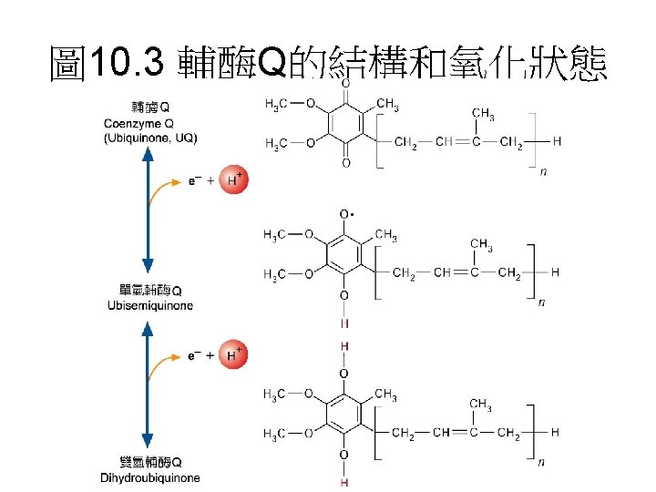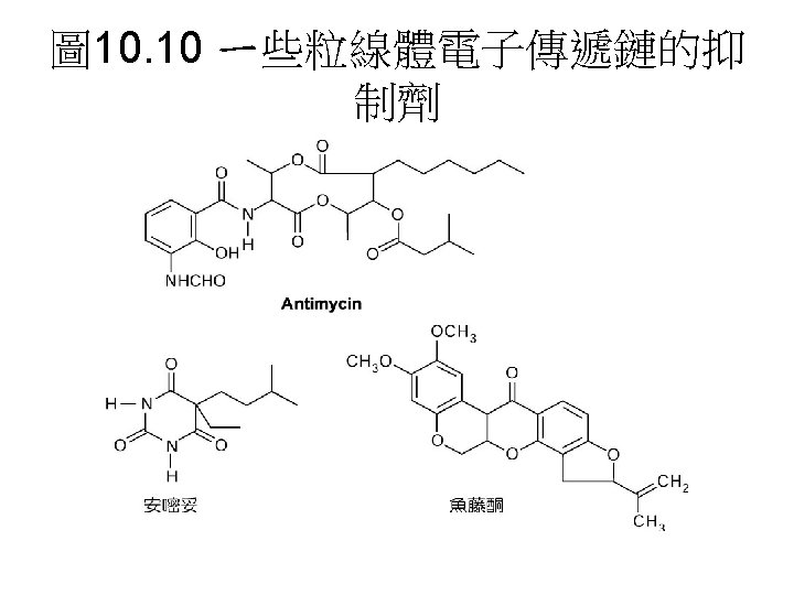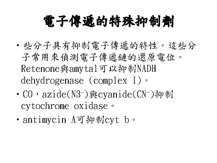 In the presence of an electron donor and O 2, each inhibitor causes a characteristic pattern of oxidized/reduced carriers; those before the block become reduced (blue), and those after the block become oxidized (red). 電子傳遞鏈 中電子傳遞順序與其阻斷劑。