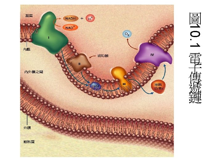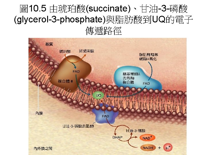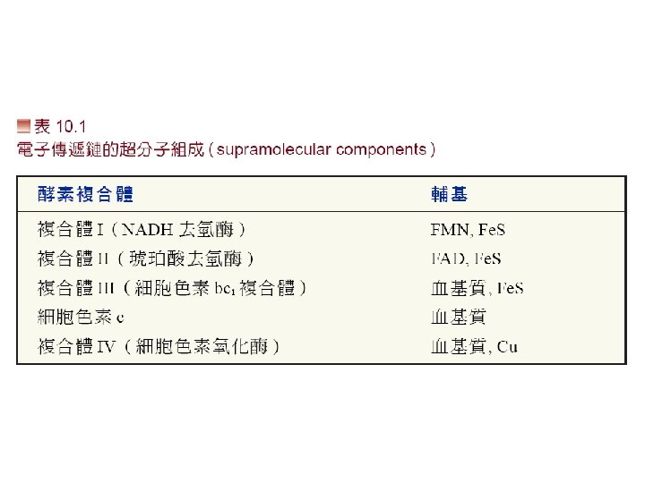 • 主要有4個complex組成: • 1 Complex I: NADH dehydrogenase complex • 功能: 催化電子由NADH傳至 UQ(ubiquinone)。 • 2 Complex II: Succinate dehydrogenase complex: 主要是由Succinate dehydrogenase與2個硫鐵蛋白組成。功能 是催化電子由FADH 2傳至UQ。