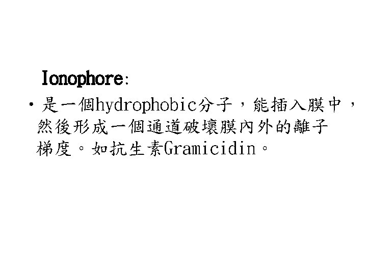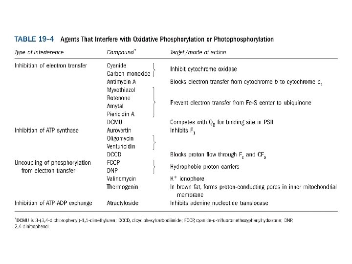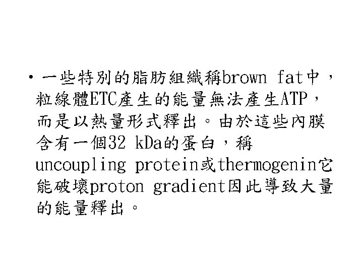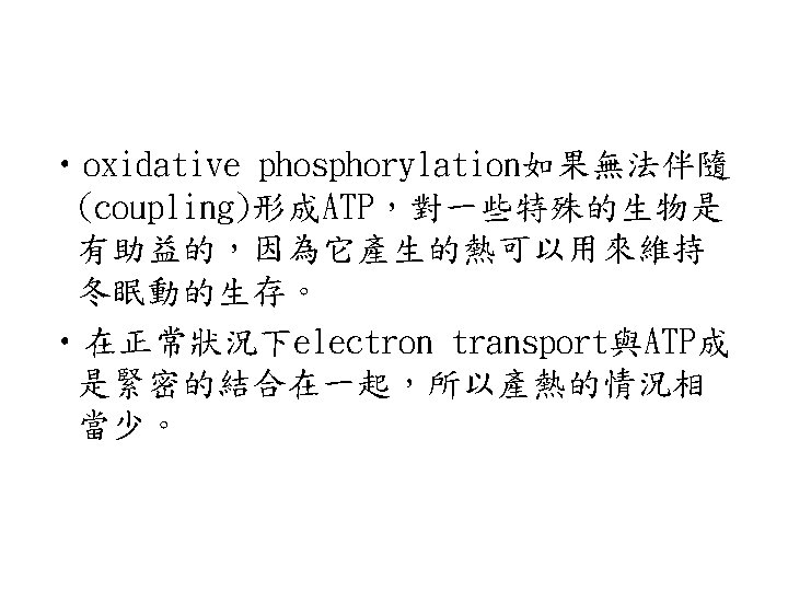 • Uncoupler: • 可攜帶H+離子進出內膜,導致proton gradient的破壞的物質。使得電子傳遞 與oxidative phosphorylation無法伴隨 發生(coupling)。如2, 4, Dinitrophenol (DNP)。