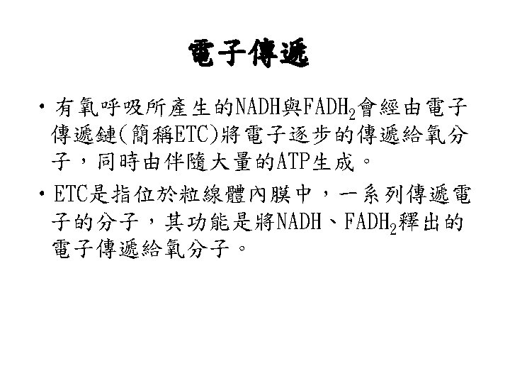 Oxidative phosphorylation • Electro-transfer reaction in mitochondria • ATP synthesis 氧化磷酸化反應: 1粒線體中的電子傳遞反應 2 ATP的合成 Regulation of oxidative phosphorylation 氧化磷酸化反應的調節