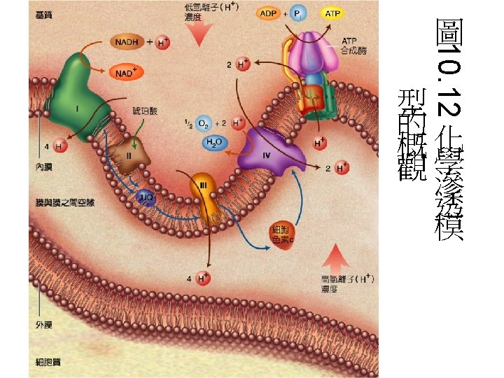 • Because the transfer of two electrons from NADH to O 2 is accompanied by the outward pumping of 10 H+, roughly 200 k. J of 220 k. J released by oxidation of a mole of NADH is conserved in the proton gradient. • 估算 1 mole NADH約可打出 10 mole個質 子,花費約200 -220 kj 的能量。