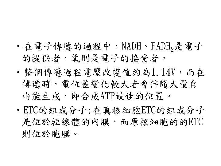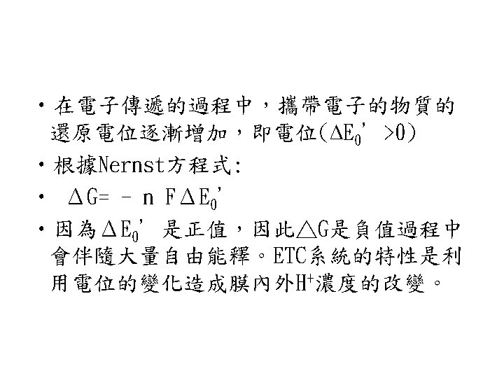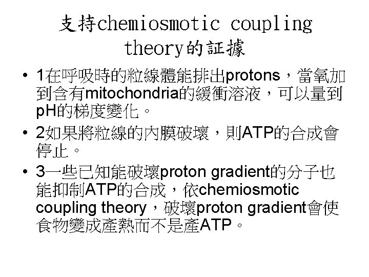 • 1961年,Peter Mitchell提出一個稱為 Mitchell’s model又稱chemiosmotic coupling theory理論 • 1當電子通過ETC時,proton(H+)會由粒線 體的matrix輸送至intermembrane space形 成電化學的proton gradient,是一種 protomotive force,即質子趨動力。