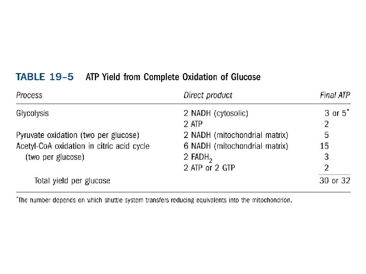 Shuttle systems indirectly convey cytosolic NADH into mitochondria for oxidation 1. malate-asparate shuttle— producing 2. 5 ATP. 肝與心臟細胞 2. Glycerol 3 -phosphate shuttle—producing 1. 5 ATP. 肌肉與腦細胞