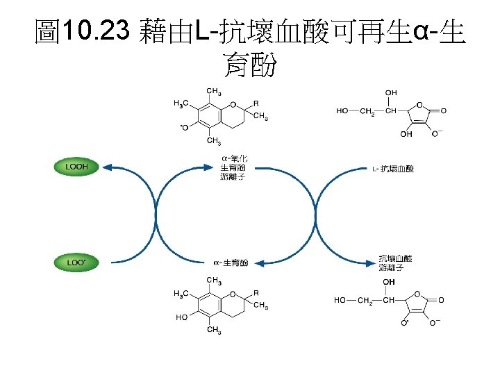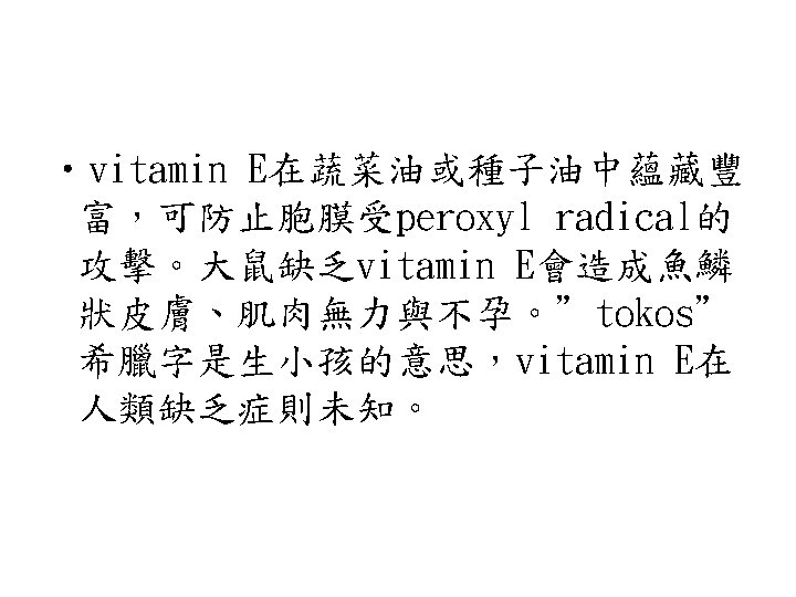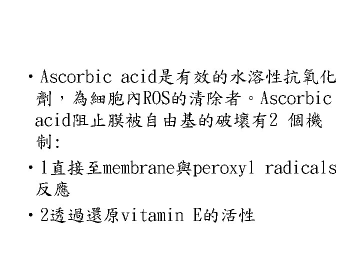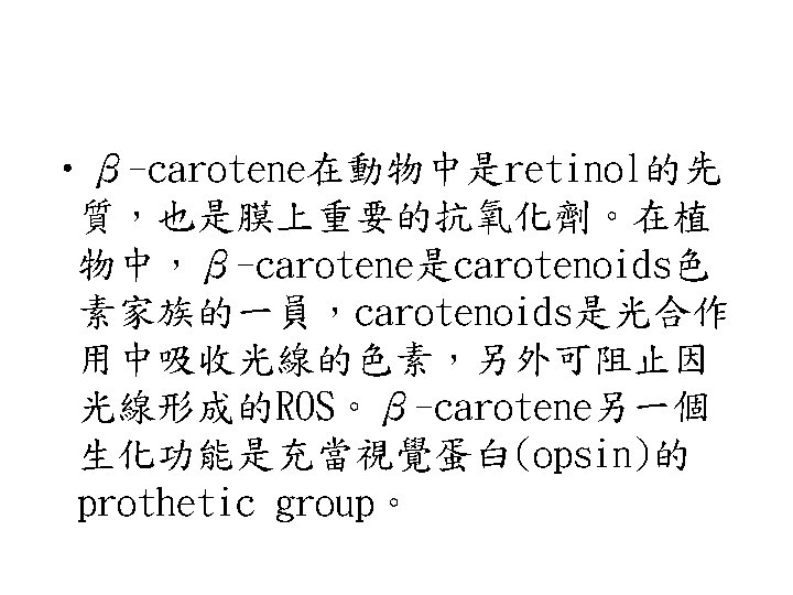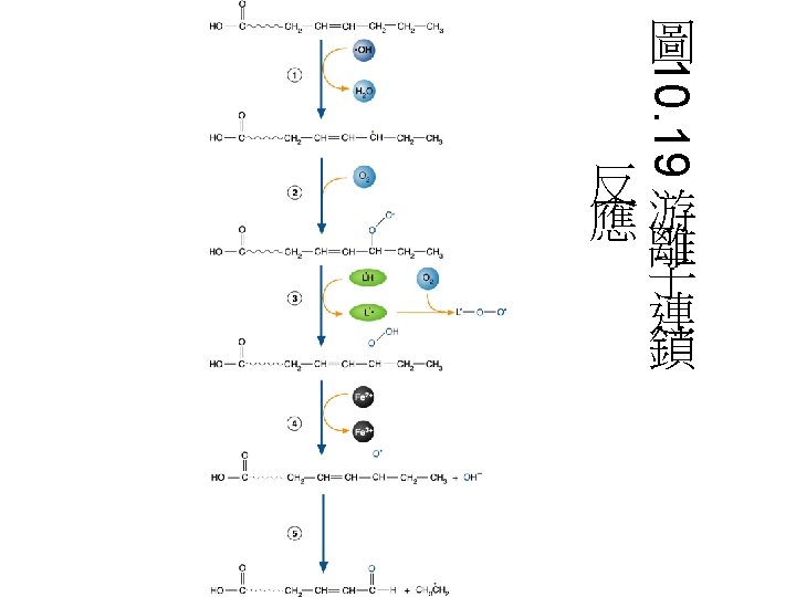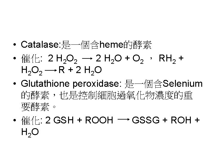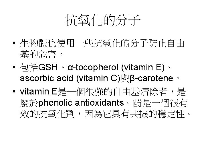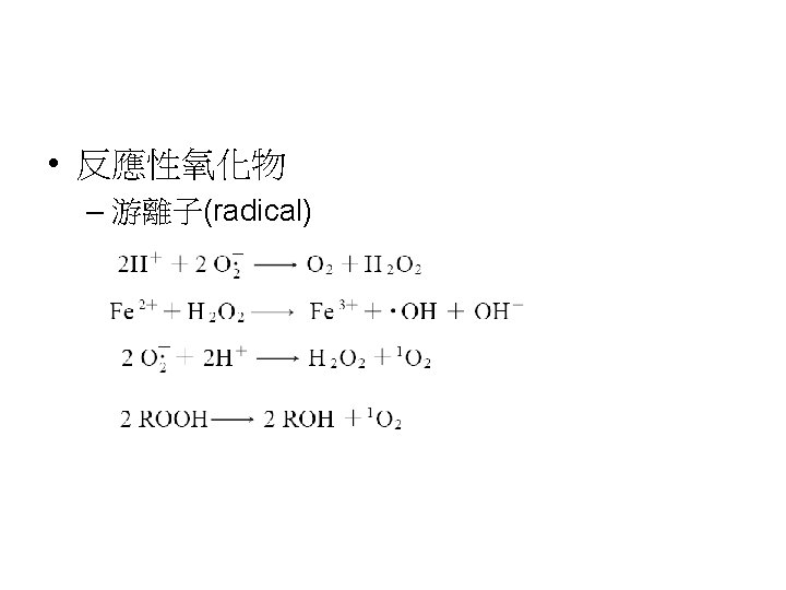 Reactive oxygen species (ROS) • ROS包含Superoxide radical (.O 2 - )、 hydrogen peroxide (H 2 O 2)、hydroxyl radical (.OH)與singlet oxygen ( 1O 2 )。因為ROS相當reactive,易引起一些鏈 鎖反應。如lipid peroxidation reaction: hydroxyl radical會攻擊一些脂肪酸,引 起鏈鎖反應。食品加 時常會促進這種 radical chain reaction,常需加入抗氧 化劑,阻止radical chain reaction的反應。