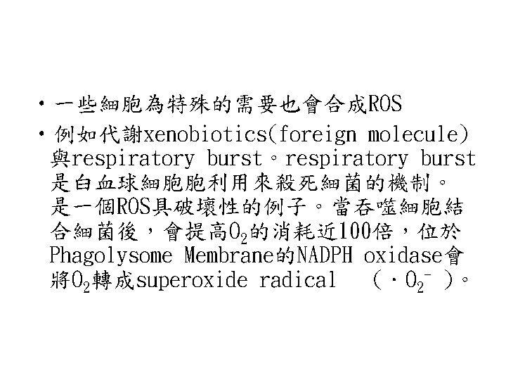 • The superoxide free radical generated, ·O 2 - is very reactive and can damage enzymes, membrane lipids, and nucleic acids. • Superoxide含自由基對酵素、膜與核酸具 破壞性。