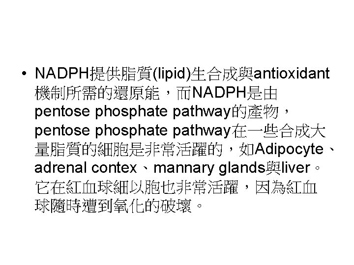 • Glutathione reductase再將GSSG還原成 GSH • GSSG + NADPH + H+ 2 GSH + NADP+ • NADPH主要是由pentose phosphate pathway提供