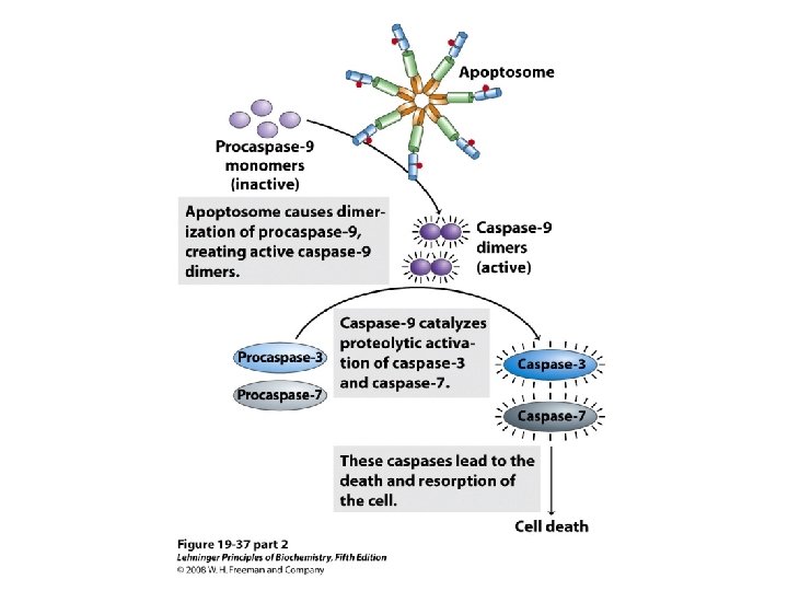 The role of mitochondria in apoptosis • Besides their central role in ATP synthesis, mitochondria also participate in processes associated with cellular damage and death. 除了 合ATP的角色,粒線體也參與細胞損壞與死亡的 過程。 • Apoptosis: Programmed cell death, in which a cell brings about its own death and lysis, signaled from outside or programmed in its genes, systematically degrading its own macromolecules. 細胞凋亡,是計劃性的細死亡。 當細胞接受到死亡訊息,會增加粒線體外膜的通 透性。有利 於cytochrome c 漏出,漏出的 cytochrome c會活化caspase 9,導致細胞凋亡的 啟動。