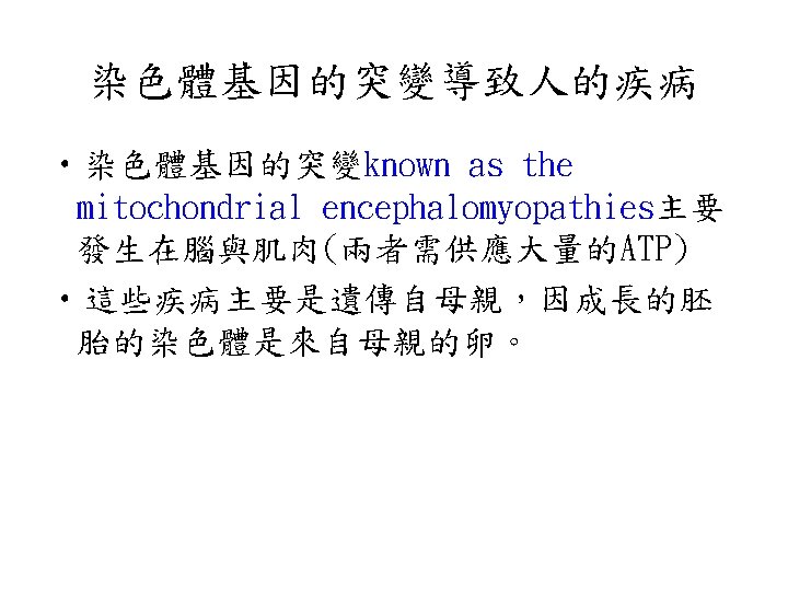 染色體基因突變的遺傳疾病 • 賴博氏遺傳性視覺神經症 ( Leber Hereditary Optic Neuropathy, LHON ) • Myoclonic epilepsy and ragged-red fiber disease (MERRF)(肌陣攣性癲癇發 作伴破碎紅纖維病變)