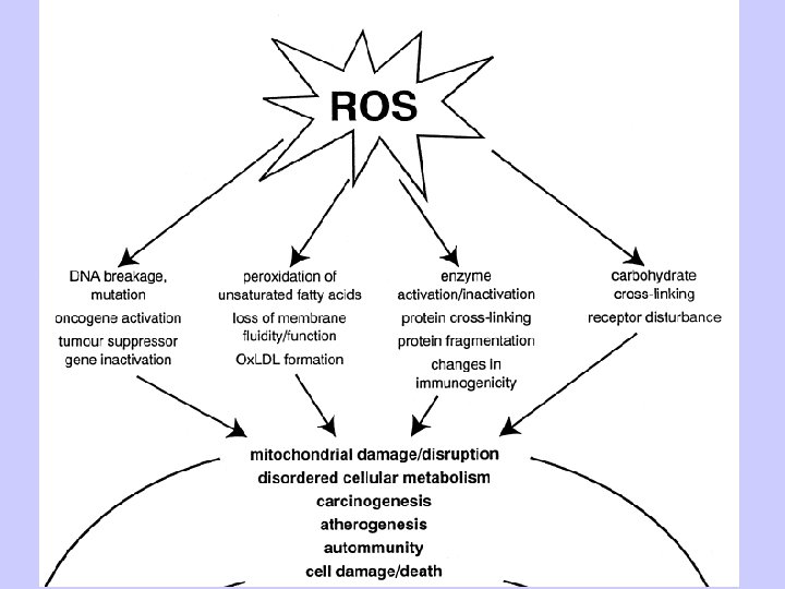 Reactive oxygen species (ROS) • ROS – OH. (hyroxyl radical) – O 2 -. (superoxide radical) – H 2 O 2 (hydrogen peroxide) – NO. (nitric oxide) • Oxidative stress • Oxidative damage