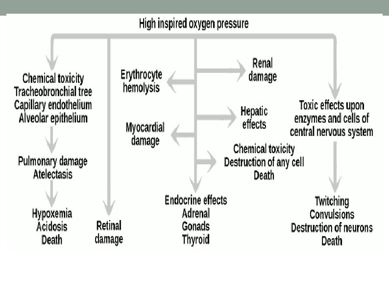 COMPLICATIONS OF OXYGEN TOXICITY The common affected sytems/organs are: a) CNS - Convulsions(tonic–clonic seizure). b) Pulmonary - Atelectasis. c) Eyes - Retinal damage. q
