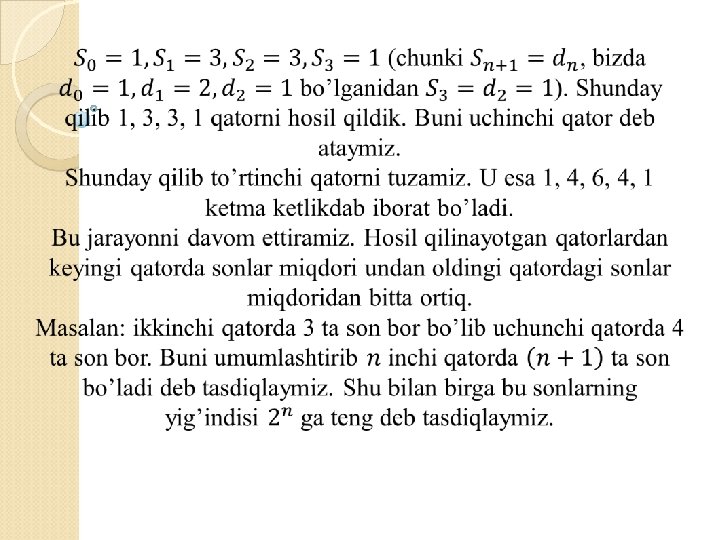 1 – jadval 1 2 3 4 5 6 7 8 9 10 11 12 13 14 15 16 17 18 19 Qator o’rni 0 1 Nolinchi 1 1 1 Birinchi 2 1 2 1 Ikkinchi 3 1 3 3 1 Uchinchi 4 1 4 6 4 1 To’rtinchi 5 1 5 10 10 5 1 Beshinchi 6 1 6 15 20 15 6 1 Oltinchi 7 1 7 21 35 35 21 7 1 Yettinchi 8 1 8 28 56 70 56 28 8 1 Sakkizinchi 9 1 9 36 84 126 84 36 9 1 To’qqizinchi