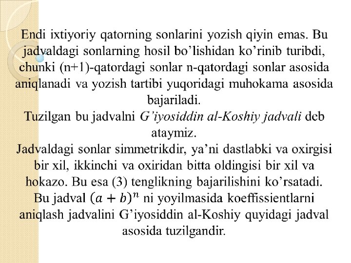 Reja: 1. Simmetrik sonlar 2. G’iyosiddin al-Koshiy uchburchagi 3. Irratsional sonlarni hisoblashda G’iyosiddin al- Koshiy usuli. G’iyosiddin al-Koshiyning binom formulasi asosida irratsional sonni hisoblash