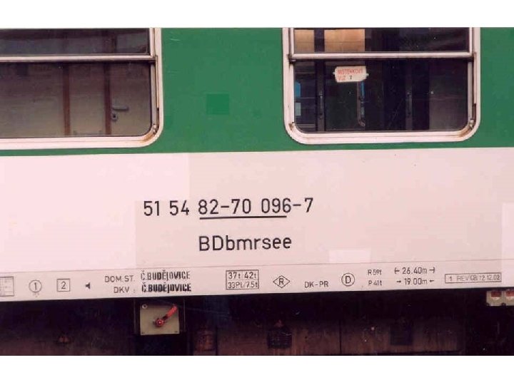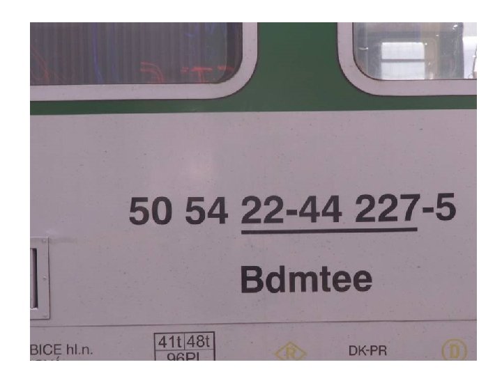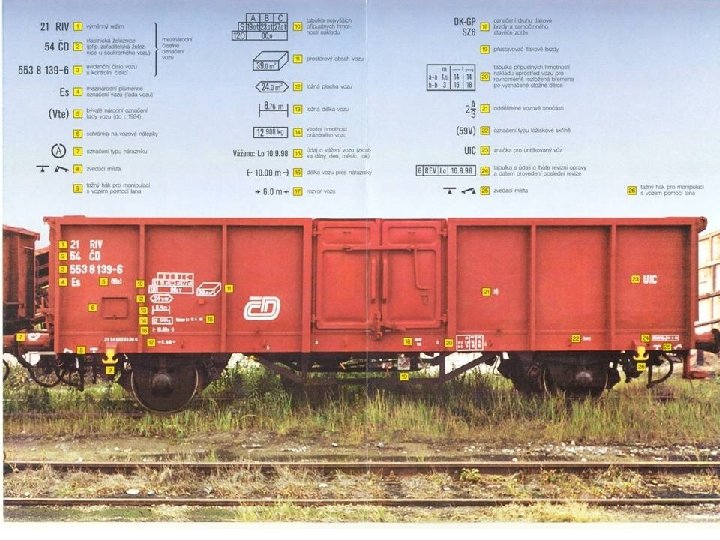 ČD AB CD EF – GH IJK - L XYZ abc. d • • • AB. . . režim vozu CD. . . vlastnická železnice EF – GH IJK. . . vlastní číslo vozu L. . . kontrolní číslice XYZ. . . písmenné označení abc. d. . . doplňkové číslo (kód vozu)