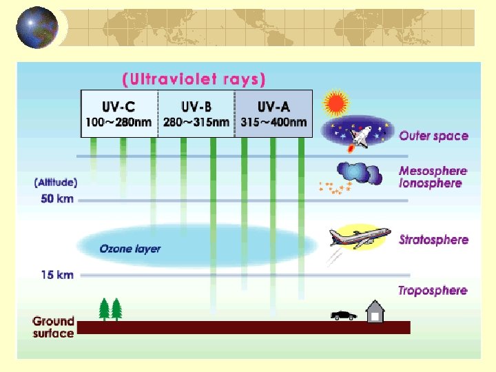 Ultraviolet Radiation 230 -280 nm damages nucleic acids Stops reproduction of cells by breaking apart the DNA bonds Ozone production peaks at 185 nm Ozone absorbance and destruction at 200 -320 nm Ozone formation Ozone destruction