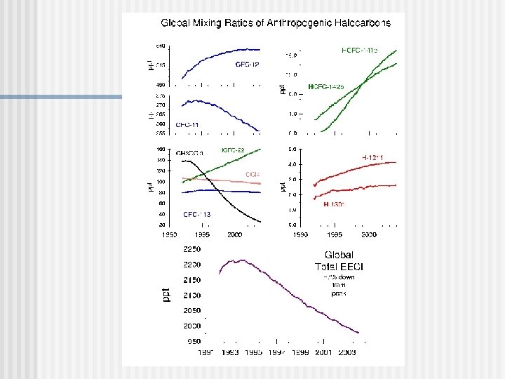 Recovery of Ozone Layer n n Since the adoption and strengthening of the Montreal Protocol has led to reductions in the emissions of CFCs, atmospheric concentrations of the most significant compounds have been declining. These substances are being gradually removed from the atmosphere. By 2015, the Antarctic ozone hole would have reduced by only 1 million km² out of 25 Complete recovery of the Antarctic ozone layer will not occur until the year 2050 or later. A detectable recovery will not occur until around 2024, with ozone levels recovering to 1980 levels by around 2068.