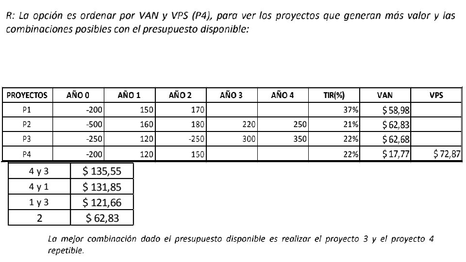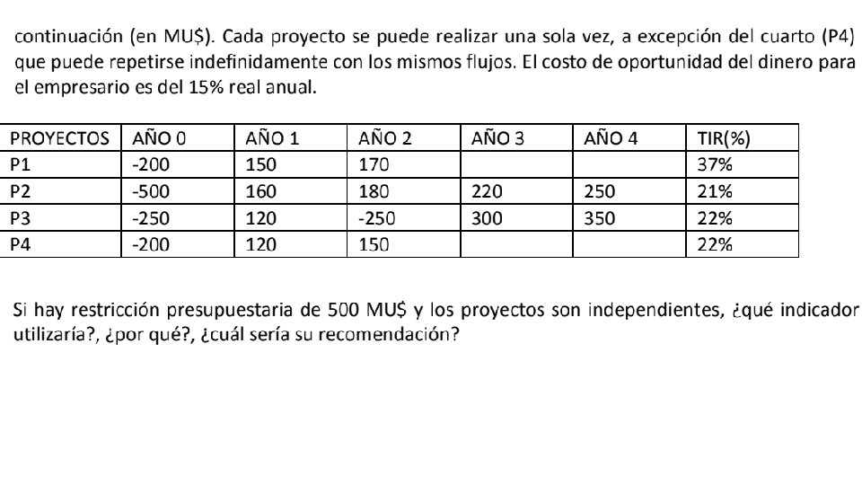 • Un amigo lo invita a participar en su proyecto que tiene un VAN mayor que cero, ¿qué necesitas para tomar la decisión? • R: Conocer el flujo de caja del proyecto, el análisis de mercado y mi costo de oportunidad para calcular el VAN con mi tasa de descuento y ver si tiene buenos resultados como inversión propia.