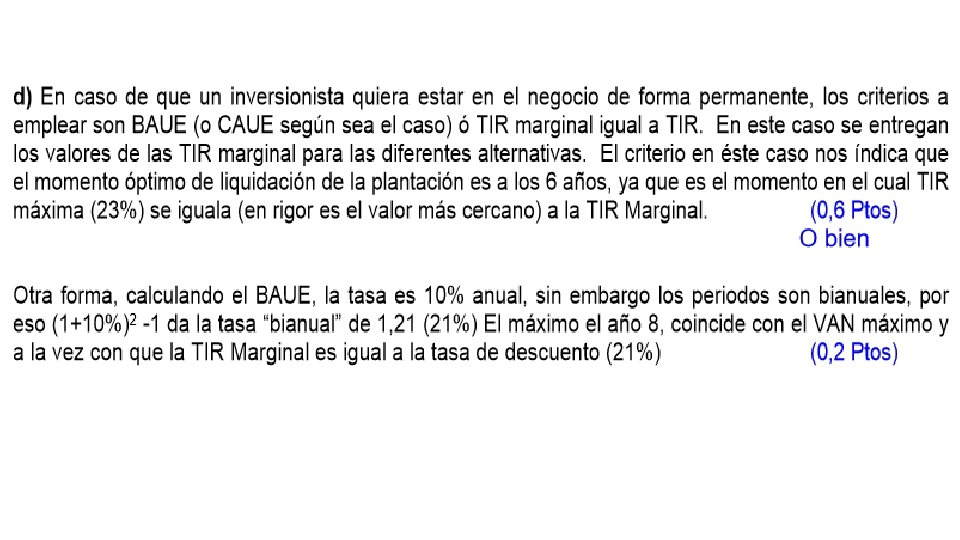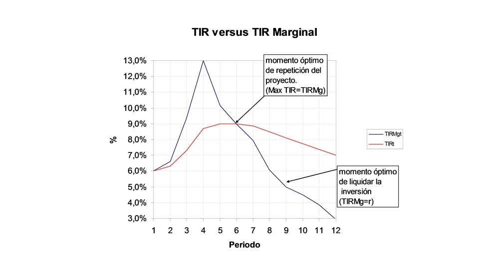 En el ejemplo, si el inversionista corta los árboles en el año 9, obtendrá una rentabilidad de 8, 1% (TIR), si ese capital lo reinvierte en el mercado sólo ganaría un 5%, pero si lo reinvierte nuevamente en el bosque, obtendrá un 8, 1%, pero mejor que eso es obtener un 8, 5%, lo que se da al cortar en el año 8, por lo tanto convendrá cortarlos en el año en que la TIR se hace máxima. • El momento óptimo para liquidar la inversión, en el caso de un proyecto repetible, es aquél para el cual la TIR es máxima e igual a la TIR Marginal.