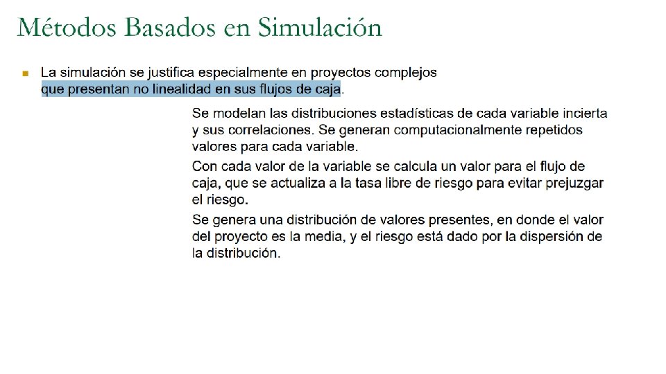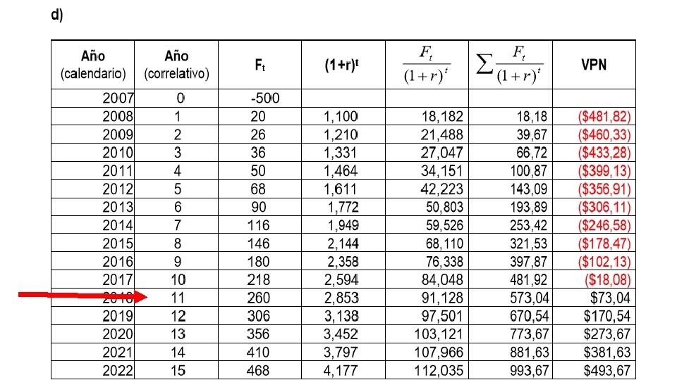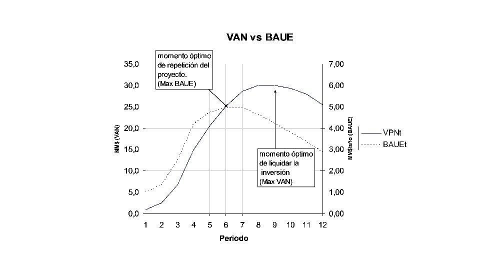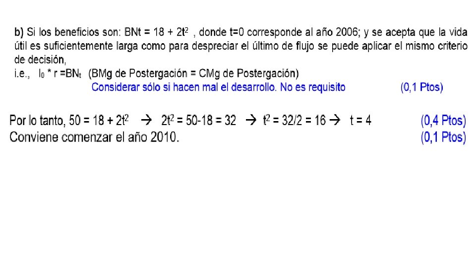 El proceso de calcular VAN debe hacerse año por año (si resulta ser positivo), y se habrá llegado al momento óptimo cuando VAN =0. Reordenando los términos, se llega al momento óptimo cuando: Mientras mayor sea el tipo de interés y mientras más larga sea la vida del proyecto, el segundo término de la ecuación se aproxima a cero, de modo que, en general, será cierto que conviene postergar la iniciación del proyecto hasta el momento en que los beneficios del primer año de vida, más el aumento en costos de construcción, son iguales al “ costo de capital” del proyecto. Si la inversión no cambia, nuevamente llegamos a que convendrá postergar hasta que Ft= r*I.