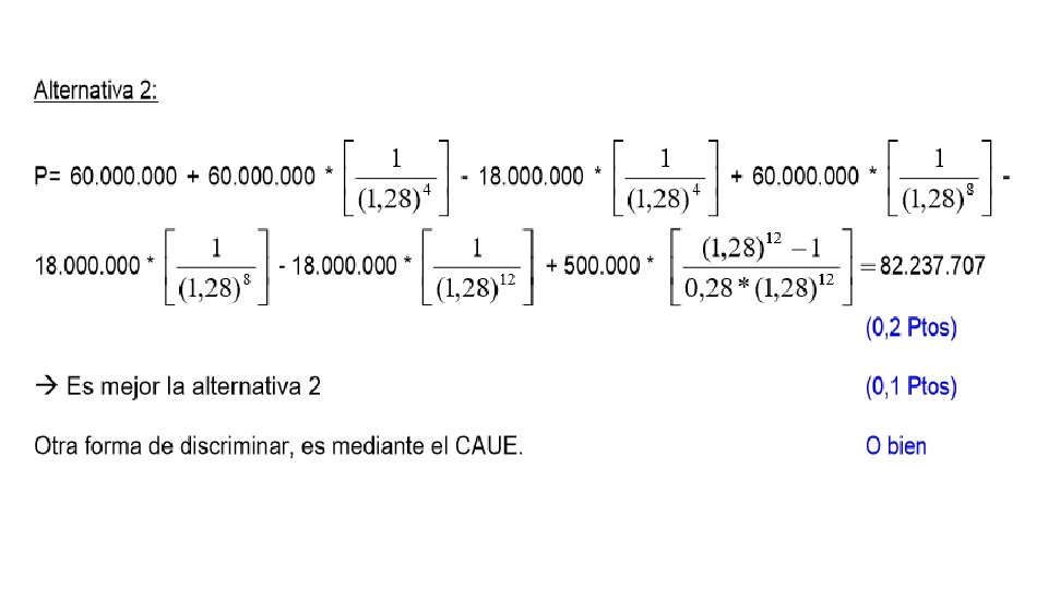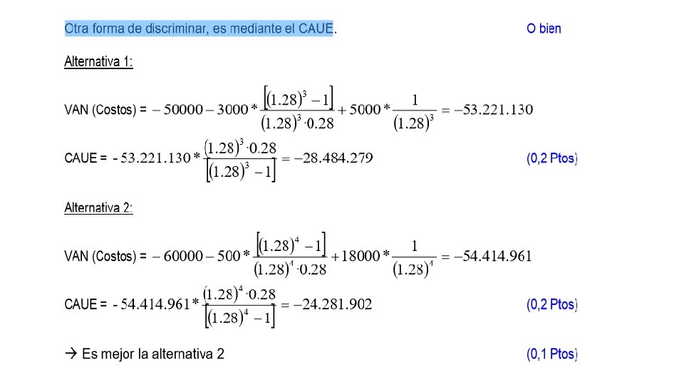 Para resolver el problema, se calcula el Costo Anual Uniforme Equivalente (CAUE) que expresa un perfil de costos irregular en forma de un pago anual uniforme y equivalente en términos de VAN. Para la máquina A: Entonces, tenemos: Para la máquina B: