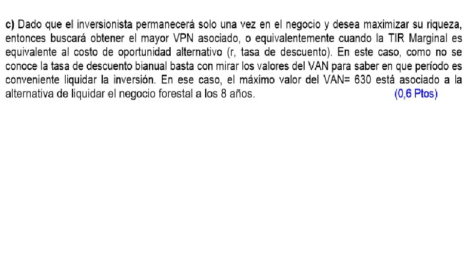 Aclaraciones • TIRMg=indica el retorno o rentabilidad obtenida en un año en particular, respecto del año anterior. El VAN del proyecto liquidando la inversión en diferentes períodos, se hace máximo cuando la TIR marginal iguala el costo de oportunidad del inversionista (TIRMg=r). Esto ocurre porque en un período cualquiera, digamos t, el inversionista debe preguntarse ¿corto ahora el bosque o no? La respuesta es ver cuál es el VAN o la TIR del proyecto marginal de postergar el corte de la madera. Si VAN>0 o, equivalentemente, TIRMg>r, entonces la recomendación es postergar el corte. En el ejemplo, estas condiciones se mantienen hasta el año 9. Luego ese es el año óptimo de liquidar la inversión.