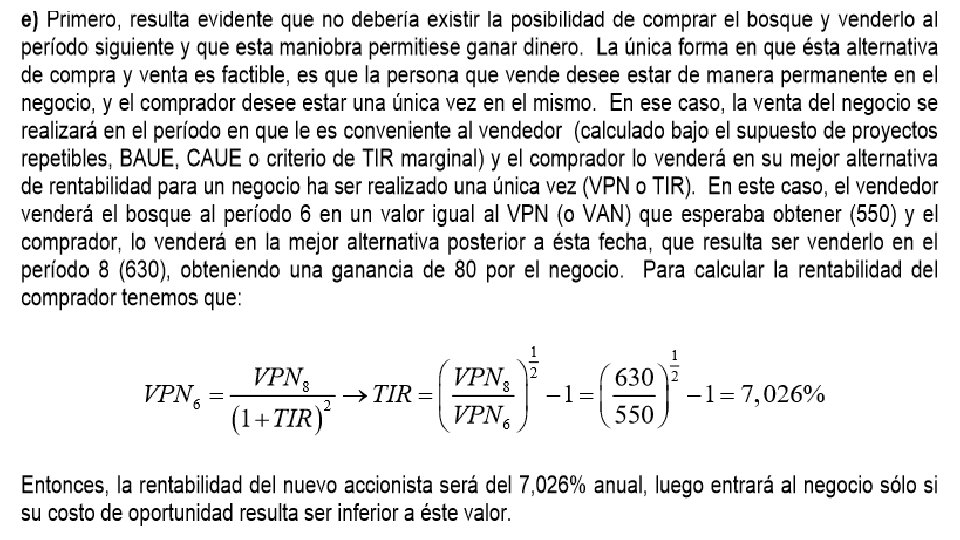 Si el costo de oportunidad del dinero del comprador es 5%, entonces el precio de venta máximo que puede obtener el dueño del proyecto es igual a: A este precio de venta el VAN del comprador es igual a cero, y por lo tanto estaría indiferente entre comprar el bosque a ese precio o dejar sus recursos rindiendo un 5% en su mejor alternativa (su costo de oportunidad del dinero). Luego, al inversionista maderero le conviene más vender el bosque al final del año 6 en vez de cortar el bosque y vender la madera, ya que 174, 13>167, 7, por lo que obtiene una ganancia adicional de 6, 44 y una TIR de 9, 7%: