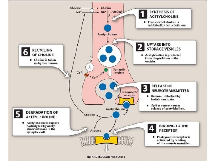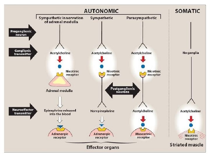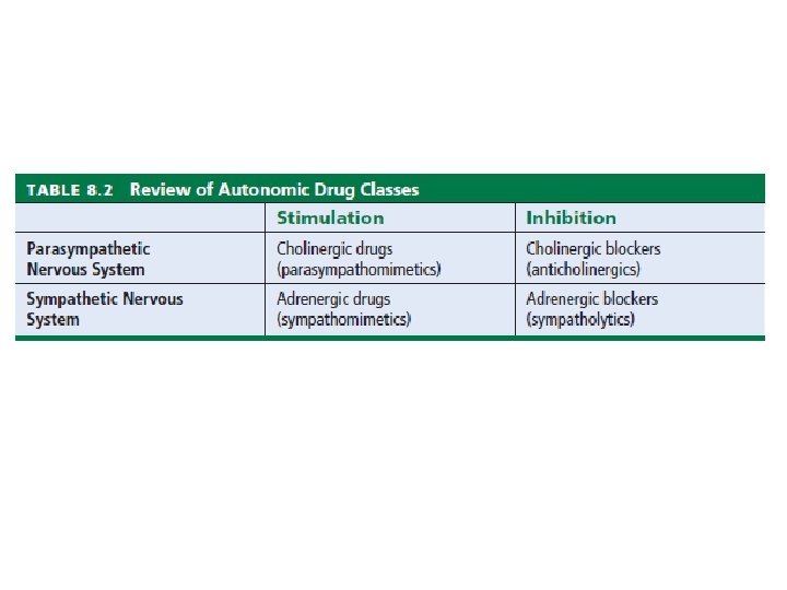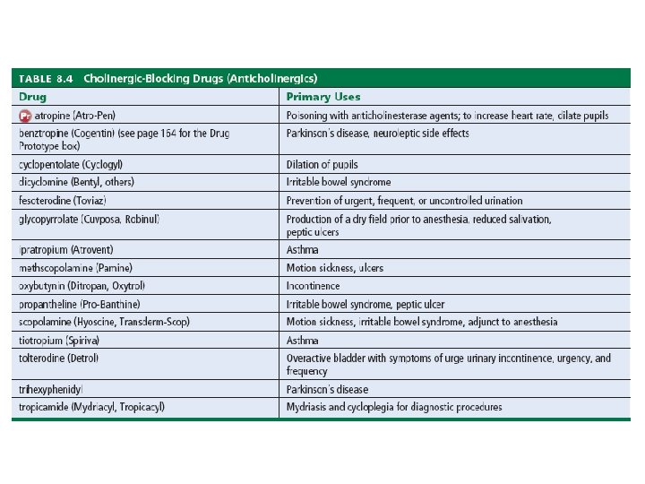 Antikolinergici: Blokatori muskarinskih receptora: poznavati atropin i skopolamin. Blokatori nikotinskih receptora- samo neuromuskularne veze.