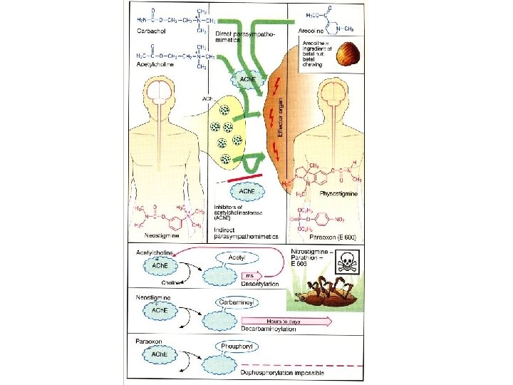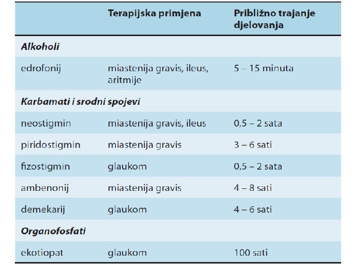 Kolinomimetici ili parasimpatomimetici • Neizravni – inhibitori Ach-esteraze EDROFONIJ NEOSTIGMIN FIZOSTIGMIN ORGANOFOSFATI – irevrzibilni inhibtori Ach-esteraze bojni otrovi i pesticidi
