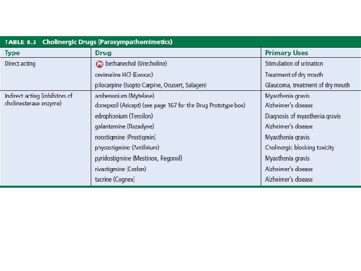 Parasimpatomimetici: Neposredni: poznavati učinke i ulogu acetilkolina i prirodnog alkaloida pilokarpina. Posredni kolinomimetici: samo fizostigmin i neostigmin (znati samo za što se upotrebljavaju i koja je logika te upotrebe. Niti za jedan lijek ne treba pamtiti doze!) Ireverzibilni blokatori acetilkolin-esteraze - znati da postoje i da insekticidi – organofosfati djeluju na taj način. Nije potrebno pamtiti imena preparata i otrova.
