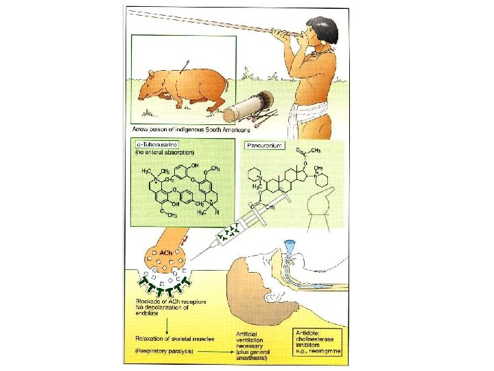 - Nedepolarizirajući (kompetitivni antagonisti) TUBOKURARIN, PANKURONIJ, vekuronij (Antidot: neostigmin) - Depolarizirajući SUKSAMETONIJ (sukcinilkolin) (Indikacije: iv. u anesteziji kao miorelaksator. Nema antidota! Oprez!)