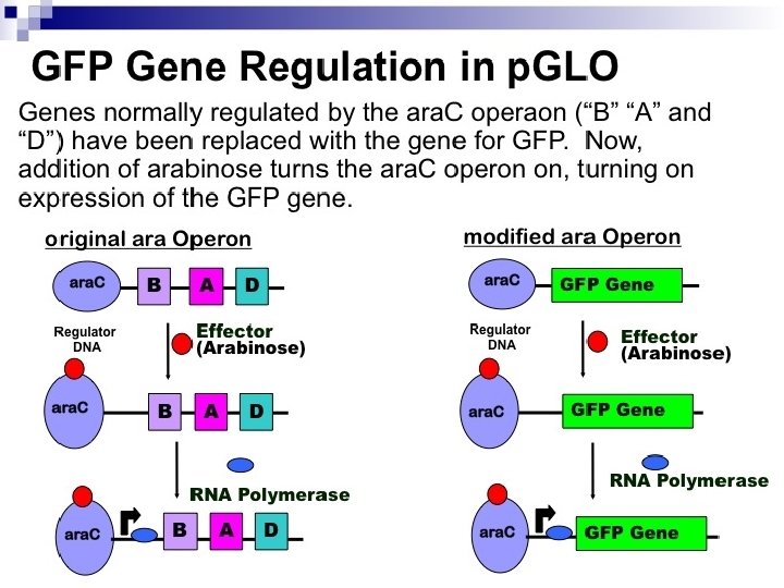 p. GLO Regulation ara Operon ara. C B A D GFP Gene Effector (Arabinose) ara. C B A D GFP Gene RNA Polymerase ara. C B A D GFP Gene GFP GENE HAS BEEN ADDED TO ara OPERON WHEN ARABINOSE IS PRESENT, OPERON IS TURNED ON and GFP GENE IS EXPRESSED TOO Cells “glow” on media with arabinose