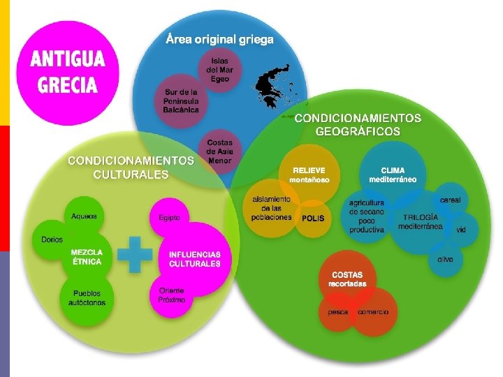 El escenario geográfico de los griegos p p p - Cuenca del mar Egeo: península de los Balcanes, islas egeas y las costas Asia Menor Predominan las montañas y escasean las tierras planas Presenta un clima templado tipo mediterráneo El mar es accesible y de fácil navegación en la época cálida Características culturales de los griegos Estrecha relación con su paisaje Se privilegia la navegación Desarrollo independiente de las poleis (plural de polis)