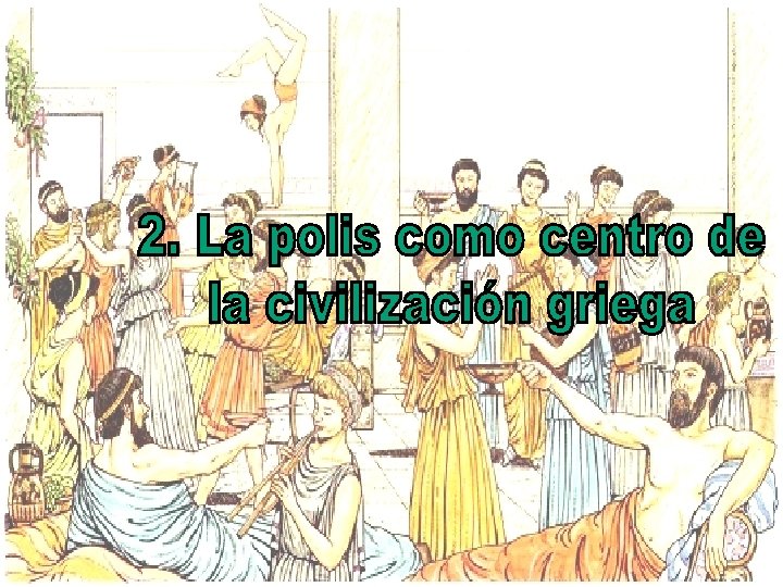 El pueblo griego, una comunidad cultural p Los griegos nunca formaron parte de un solo Estado, pues estaban divididos en ciudades – estados o polis p No obstante, tenían un estilo de vida similar: a) El idioma: hablar un mismo idioma era para ellos muy importante. Llamaban a “bárbaros” a los que no hablaban el griego b) La religión: eran politeístas. A través de los mitos contaban las historias de sus dioses. Realizaban celebraciones en su honor, como por ejemplo los Juegos Olímpicos, en honor a Zeus