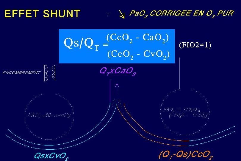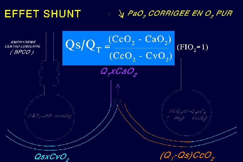 CALCUL DU QS/QT QS = Débit de shunt QT = Débit total FIO 2 = 100 % QS/QT = (Cc. O 2 - Ca. O 2) (Cc. O 2 - Cv. O 2) SO 2 = 100 % Cc. O 2 PO 2 = PAO 2 QS . Cv. O 2 (QT - QS ). Cc. O 2 QT . Ca. O 2
