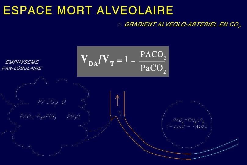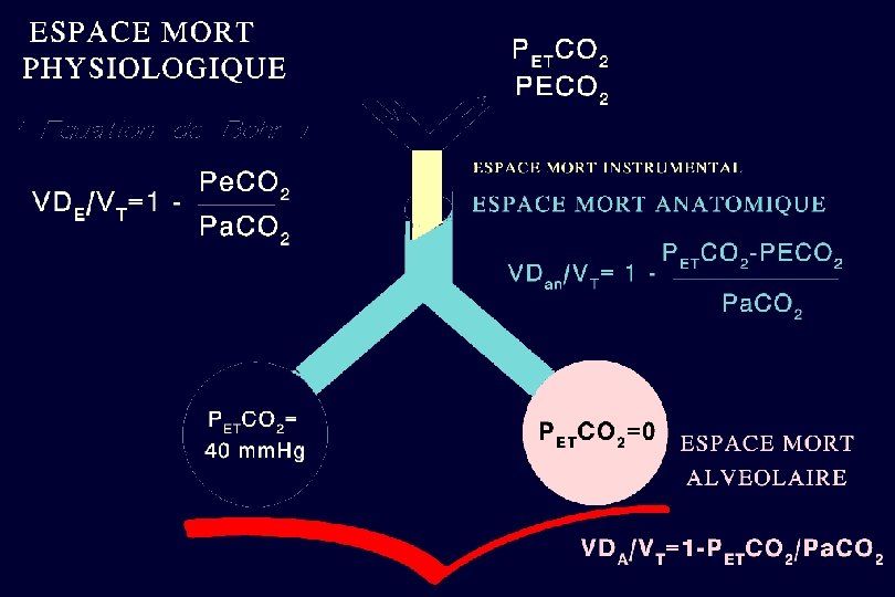 CALCUL DES ESPACES † PHYSIOLOGIQUE ET ALVÉOLAIRE EQUATIONS DE BOHR Espace † alvéolaire Volume courant Espace † physiologique Volume courant = = VDA = 1 - VT PETCO 2 Pa. CO 2 VD = VT PECO 2 1 - Pa. CO 2