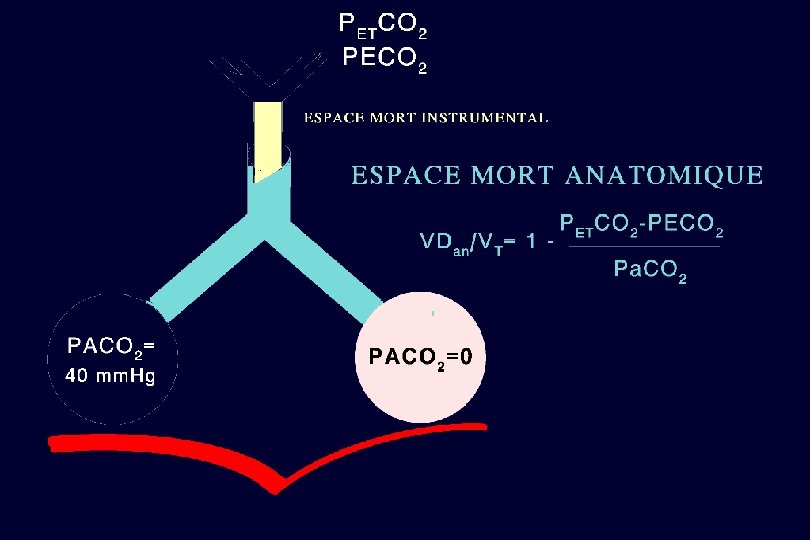 PHYSIOLOGIE DU GAZ CARBONIQUE VCO 2 (ml/min) Pa. CO 2 = x 0, 863 VA (l/min) VE (l/min) = VA (l/min) + VD (l/min) VCO 2 : Production de CO 2 VE : VA : VD : Ventilation minute anatomique Ventilation alvéolaire + Ventilation de l’espace † physiologique = alvéolaire + instrumental