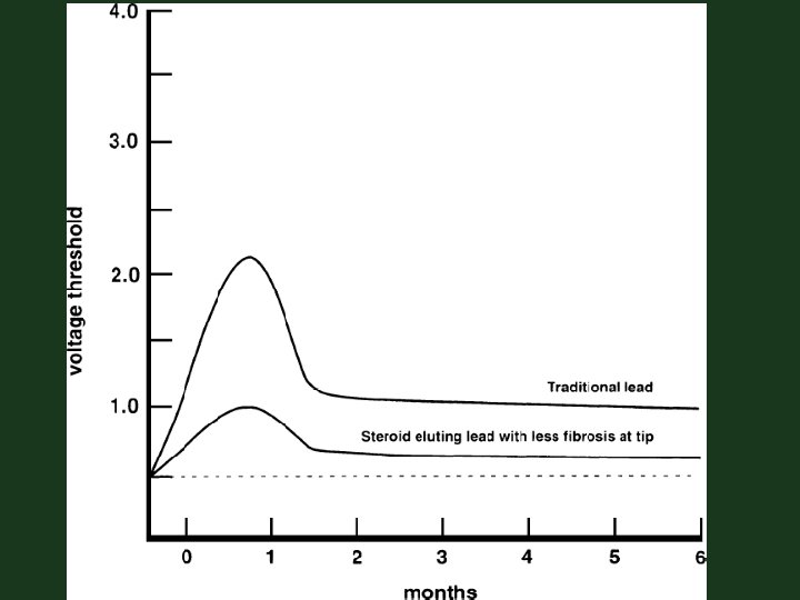 Hyperacute phase of threshold evolution- active fixation electrodes may produce, immediately following implantation, an ↑ stimulation threshold that ↓over the next 20 -30 min- transient high threshold – a/c injury at myocardial–electrode interface