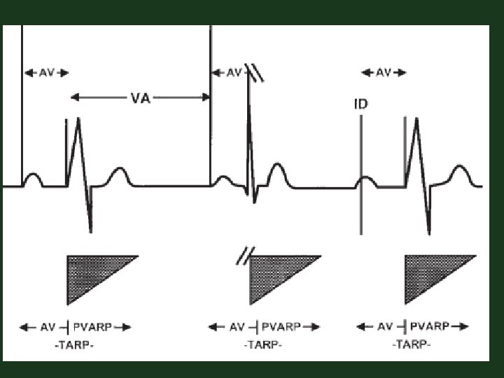 P- Native atrial depolarization A- Atrial paced event R- Native ventricular depolarization V- Ventricular paced event AV- Sequential pacing in the atrium and ventricle AVI- Programmed AV pacing interval AR- Atrial paced event foll by intrinsic ventricular ARP- Atrial refractory period PV- Native atrial foll by paced ventricular, Psynchronous • AEI- Interval from a ventricular sensed/paced to atrial paced event, the VA interval • • •