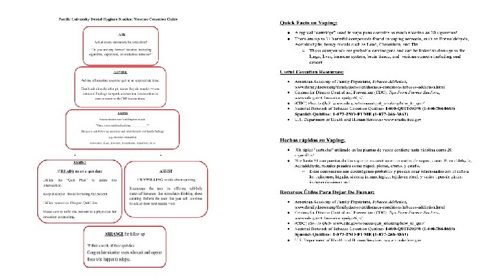 Needs Assessment ● Target population: patients who use nicotine ● We want to encourage users to decrease nicotine use and eventually quit with the help of clinicians to motivate them to do so ● Tools: chairside guides & packets for patients ● Referrals: ○ Physician for further follow-up and possible medications Knowledge about resources seemed inconsistent among students and faculty members. Calibration for consistency was needed.