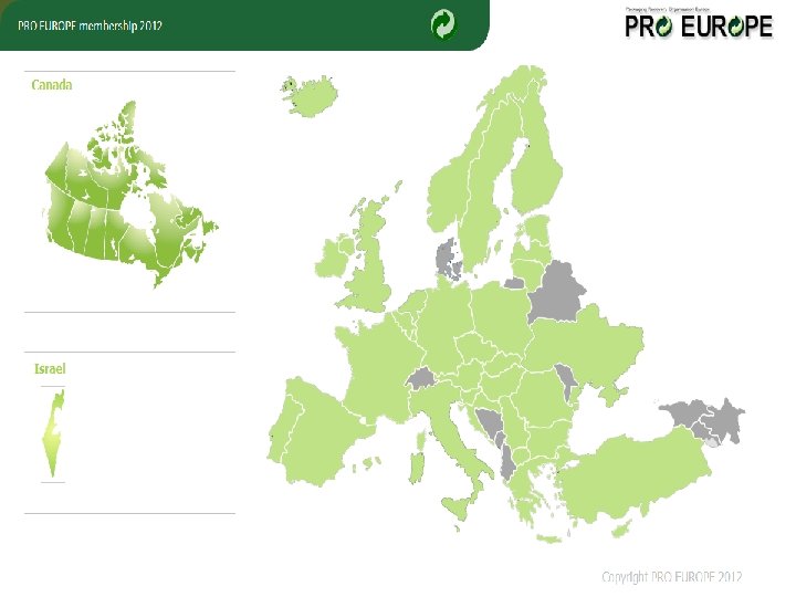 PRO EUROPE Facts and Figures 2010 -2012 Ø 35 compliance schemes active in 35 countries in 2011 of which 28 use the Green Dot Ø About 185, 000 companies are contributing licensees / members of the PRO EUROPE member systems Ø About 400 million inhabitants have access to separate collection financed by PRO EUROPE member systems Ø About 33, 300, 000 tons of packaging have been recovered by PRO EUROPE member systems in 2010 Ø More than 26 million tons of C 0² equivalent has been saved by the work of PRO EUROPE member systems in 2010 Ø More than 3, 300, 000 tons of plastic packaging have been recycled by PRO EUROPE member systems in 2010