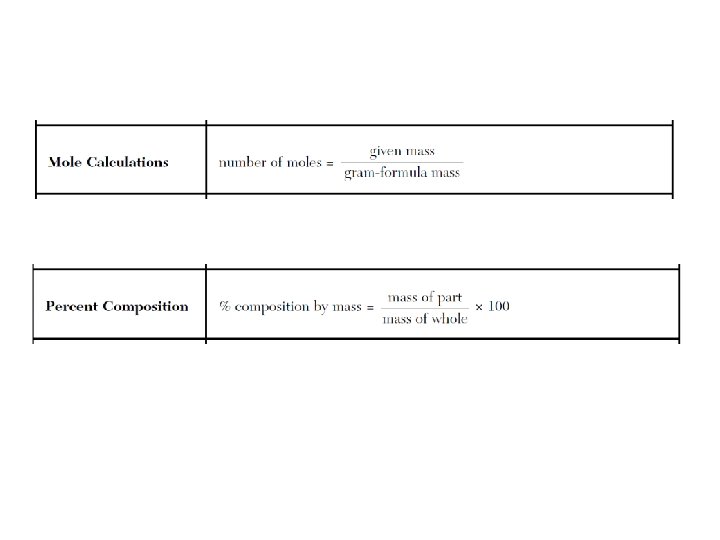 PACKET #6: Moles & Stiochiometry GFM = 1 mole = 6. 02 x 1023 molecules = 22. 4 L • • • Molecular Formula (Covalent) – Ex. C 6 H 12 O 6 Empirical Formula – Ex. CH 2 O (simplified) Mass MF/Mass EF Moles = given mass/GFM % composition = part/whole x 100 Hydrate • % composition = hydrate-anhydrate/hydrate x 100 • Stoichiometry – remember that the coefficients are the # of moles, and the ratio of the substances have