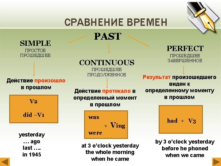 Pacкpoйтe cкoбки, yпoтpeбляя глаголы в одном из следyющиx вpeмeн: Past Simple, Past Continuous и Past Perfect. 8. When I looked were playing with a ball which (to look)out outofofthe thewindow, the thechildren chil dren (to play) with a ball which Pete (to bring) home. Pete had from brought from home. 9. By ten o'clock the children (to settled comfortably on on thethe sofa andand at ten they settle) comfortably sofa at ten they (to watch) a TV film. were watching a TV film. 10. When father (to come) home, we (to cook) the came home, we were cooking the mushrooms which we we (to gather) the wood. had in gathered in the wood. When I (to. Ann, see) she Ann, was shesorting (to sort) flowers which she (topicked pick) in the field. 11. When I saw thethe flowers which she had in the field. 12. When. I Icame (to come) home yesterday, I (to that myhad little brother (to break) 12. home yesterday, I saw that mysee) little brother broken my pen and my (to pen play) with itsplaying pieces. and was with its pieces. 13. the door of theofclassroom, I saw that teacher 13. When. I Iopened (to open) the door the classroom, I (tothe see) that had the teacher already (to come) pupilswere (to write) already comeand the pupils writingaadictation.