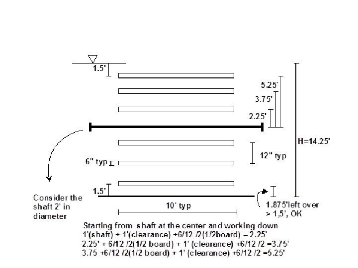 • • • • P=. 97 CDAv 3 =. 97 CDA 1 v 13 +. 97 CDA 2 v 23 +. 97 CDA 3 v 33 = . 97 CDA(v 13 + v 23 + v 33), A 1=A 2=A 3 P =. 97(1. 50)(. 5’x 10’board dim. )(2 boards, 1 up, 1 down)[24. 743+17. 673+10. 613]R 3 P=317, 976 R 3 first compartment P= VG 2 = = 2. 73 x 10 -5 lb. s/ft 2 x 51, 780. 9 ft 3 /3(3 compartments)x 452 P=950. 7 ft. lb/s x 1 hp/550 ft. lb/s P 1=1. 73 hp 950. 7 ft. lb/s / 7 wheels = 317, 976 R 3 R =. 075 rps RPM(max) =. 075 rps x 60 s/min RPM(max) = 4. 50 rpm RPM(min @ 1: 4 turndown) = 4. 50 rpm/4 RPM(min @ 1: 4 turndown) = 1. 13 rpm